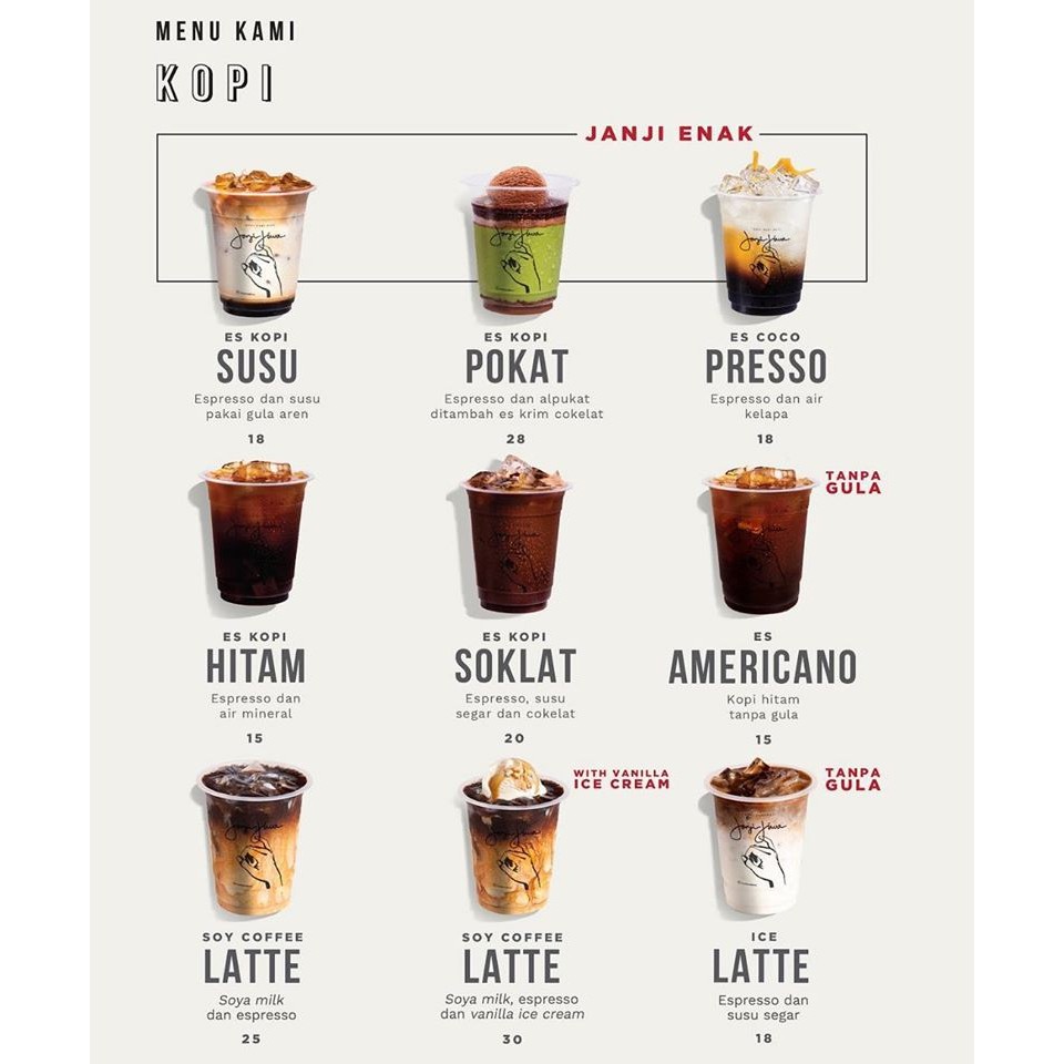 Perhatikan takaran dan step by step dalam membuatnya ya agar hasil dan rasanya. Kami menyediakan menu dari bahan kopi berkulitas yang di campur dengan susu segar. Kopi janji jiwa selalu mengangkat citarasa minuman kopi asli indonesia dengan balutan cita rasa klasik yang menggugah selera. Sejarah kopi sangat erat kaitannya dengan peradaban kaum muslim era kekhalifahan. Minum kopi saat ini sudah menjadi gaya hidup bagi sebagian atau malah kebanyakan orang. Kini, janji jiwa sukses tumbuh sebagai salah satu brand minuman kopi terbesar dan terlaris di indonesia. Dan dengan membuatnya sendiri, minum es kopinya bagi pecinta kopi, mari di simak resep es kopi susu ala janji jiwa ini. Luna boga narayan yang didirikan pertama kali oleh billy kurniawan selaku business owner di itc kuningan pada tahun 2018. Tepat di samping citylike hotel lombok dan berada di seberang sebenarnya dilihat dari aplikasi gofood, kopi janji jiwa memiliki dua kedai di kota mataram. Kopi janji jiwa saharjo berlokasi di saharjo kuliner center jalan dr saharjo jakarta selatan. Es kopi susu janji jiwa dari mas puguh ini tidak kalah dengan kopi kekinian yang dijual di gerai. Sebelum memulai bisnisnya, billy sempat merasakan naik turun dinamika wirausaha dengan 9 bidang usaha lain yang sebelumnya pernah ia rintis. Berikut kami sarankan harga kopi.